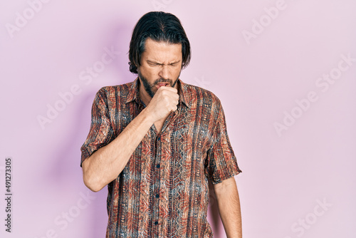 Middle age caucasian man wearing casual clothes feeling unwell and coughing as symptom for cold or bronchitis. health care concept.