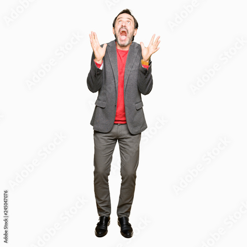 Middle age handsome business man crazy and mad shouting and yelling with aggressive expression and arms raised. Frustration concept.