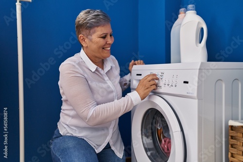 Middle age woman smiling confident washing clothes at laundry room