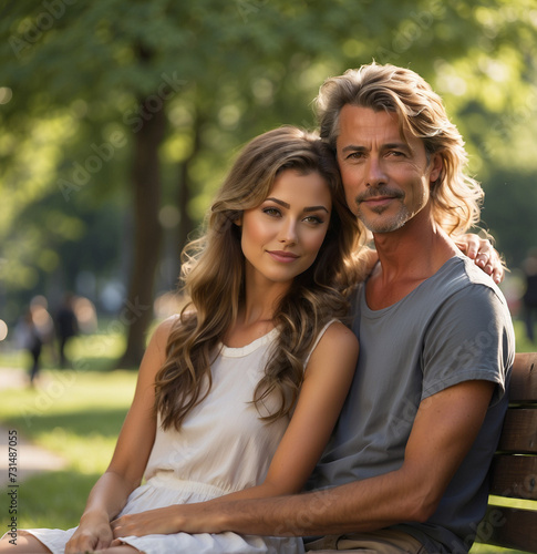 Middle aged couple sitting on a wooden bench in a park on a sunny day