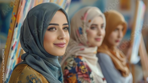 Middle Eastern women wearing hijab and their Asian and European friends attend a painting workshop to explore their creativity