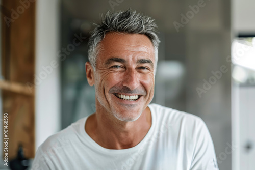 Middle-aged man with grey hair smiling broadly, wearing a white t-shirt in a bright room.