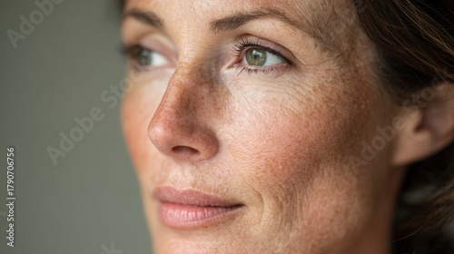 Middle-aged Woman with Scars from Surgical Procedures and Acne in a Softly Lit Portrait