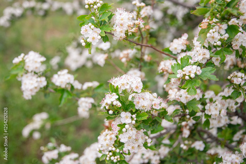 Midland hawthorn branches covered in clusters of small, delicate white flowers with pink accents, creating a beautiful springtime scene with a blurred green background