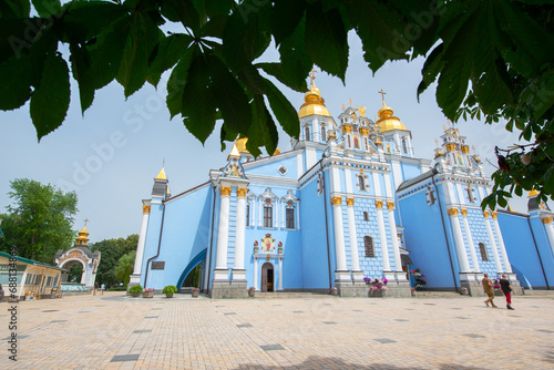 Mikhailovsky monastery with with chestnut leaves in the foreground, summer city center of Kyiv, Ukraine