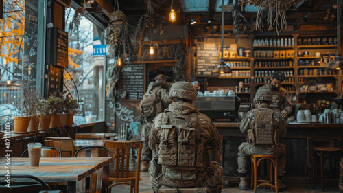 military personnel in a hipster coffee shop drinking coffee. sunny day generative ai