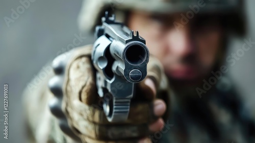 Military soldier aiming handgun in tactical stance ready for confrontation during combat training or operations against potential threats.