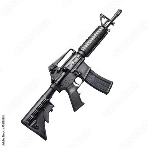 Military-style rifle displayed on a transparent background emphasizing its design features and functionality in firearms