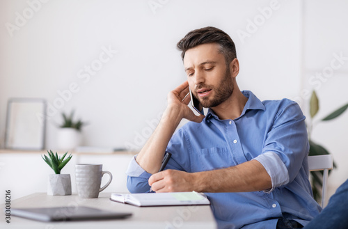 Millennial Male Entrepreneur Talking On Cellphone And Taking Notes In Office
