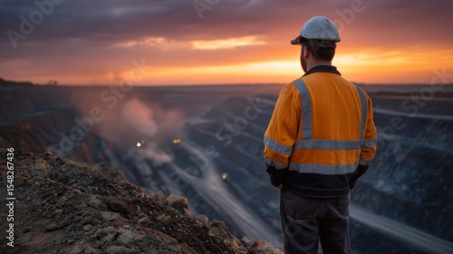 Mine Worker Surveys Vast Open-Pit at Dusk in High Visibility Gear hard work industrial power resource extraction human resilience in challenging environments