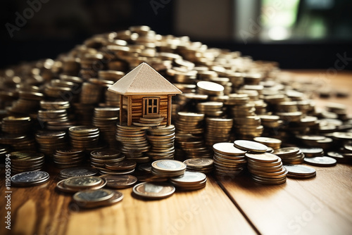 Mini House Sitting on Stacked Coins Representing Investment and Savings