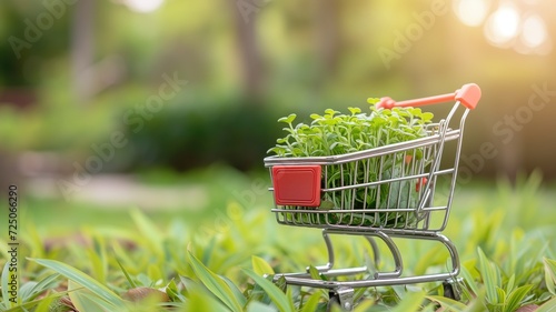 Mini shopping cart filled with green plants, symbolizing eco-friendly shopping