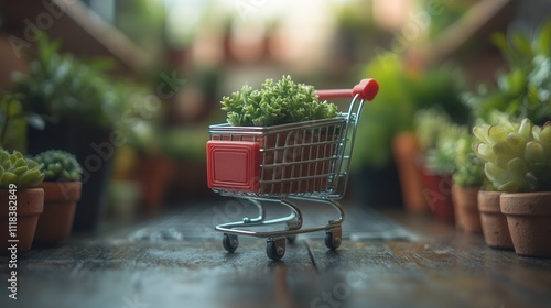 Mini Shopping Cart Filled with Succulent Plants in Greenhouse Setting
