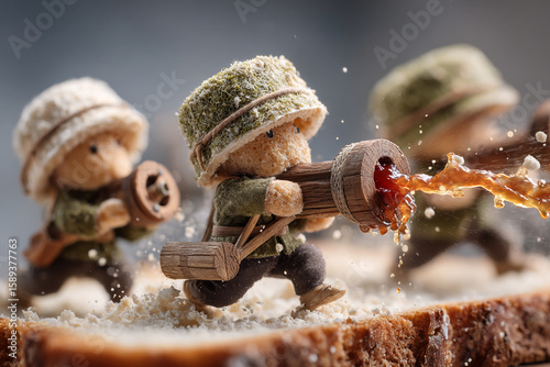 Miniature figures in military attire firing liquid from wooden cannons on toast base