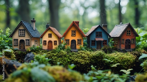 Miniature Scenic Village Lush Model Houses Glowing Windows Enchanting Design Photography