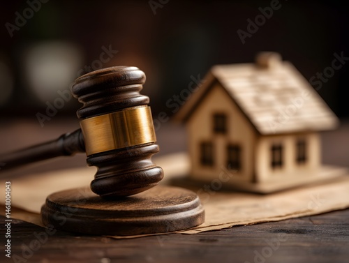Miniature Wooden House and Judges Gavel on Table with Paper