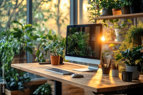 Minimal AI-controlled standing desk adjusting height, soft morning light, abundant empty space for copy or design, copy space for stock photo with minimal concept, No logo, No Trademark, No text