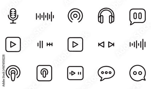 Minimal line icons pack of podcast, audio, music, play, pause, volume, speech, chat, and recording for media and entertainment design