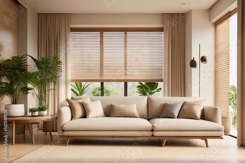 Minimal modern living room with cozy beige sofa and plants