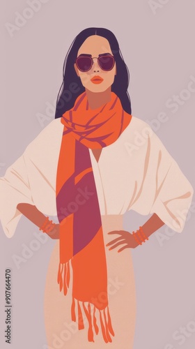Minimalism illustration, portrait of a South Asian woman, wearing a boho scarf with a tunic and a pair of cat-eye sunglasses, standing with her hands on her hips, flat illustration on light lavender