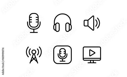 Minimalist audio icons set: microphone, headphones, speaker, antenna, and playback controls