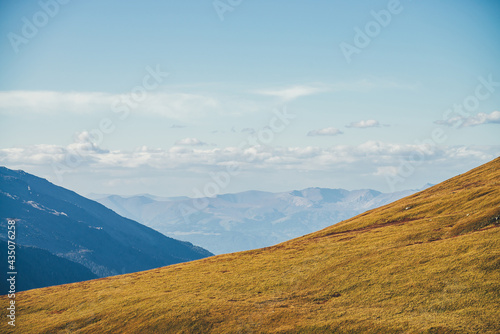 Minimalist autumn landscape with diagonal of sunlit orange mountainside on background of mountains silhouettes on horizon. Minimal mountain scenery with slope of hill in golden sunlight in autumn time