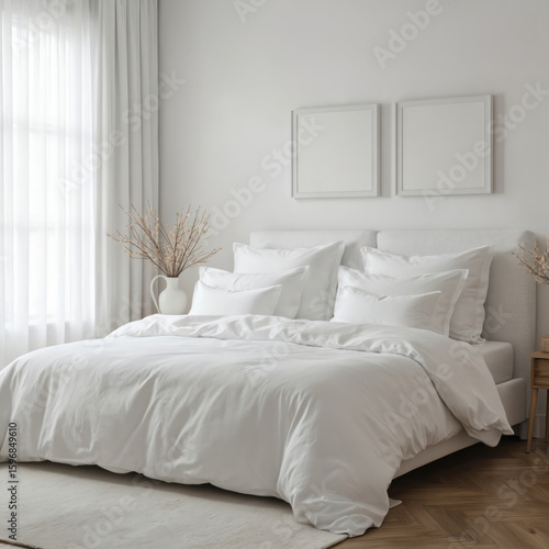Minimalist bedroom design with large white bed. White comforter, pillows, nightstands, lamps, picture frames, curtains create calm, relaxing atmosphere in interior. Light-colored wood floors, white