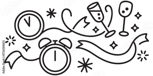 Minimalist Black and White Doodle Icons Featuring Clock, Star, Lightning Bolt, Light Bulb, and Wine Glass in Hand-Drawn Sketch Style