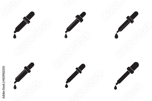 Minimalist black eyedropper pattern on white background representing science medicine chemistry or essential oils applications with clean design aesthetics for modern projects