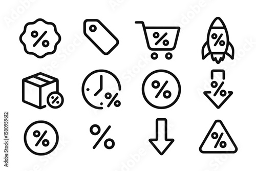 Minimalist black friday icons on dark background: discount, sale, shopping symbols