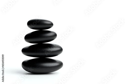 Minimalist black zen stones stacked in balance against white background, creating peaceful spa and wellness composition. Isolated for design use.