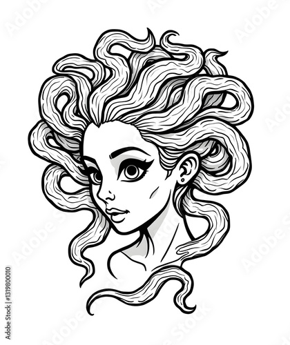 Minimalist black-and-white line art of a mythical feminine figure with serpentine hair, expressive eyes, and bold, captivating presence