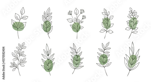 Minimalist Botanical Line Art Collection with Sage Green Abstract Shapes for Organic Design Elements