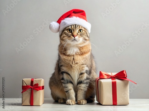 Minimalist Christmas Cat: Festive Feline in Santa Hat Next to Gifts