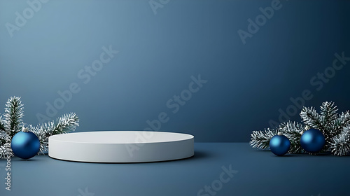 Minimalist Christmas Product Display Podium with Blue Background and Evergreen Decorations