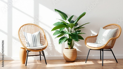 Minimalist Cozy Interior with Rattan Chair and Green Plant - Modern Decor