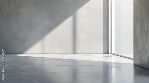 Minimalist empty room interior with concrete wall, polished floor, and large window, showcasing sunlight and shadows