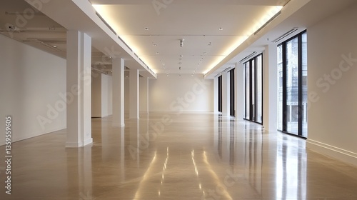 Minimalist empty space with sharp lines, clean white walls, and polished floors, illuminated by overhead recessed lighting for a modern look.