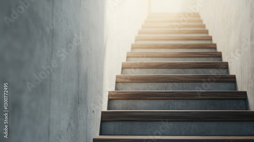 Minimalist industrial interior featuring wooden treaded staircase bathed in soft natural light, highlighting architectural simplicity