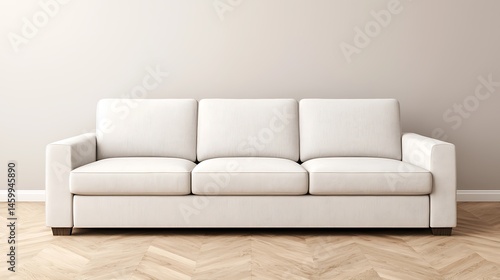 Minimalist Interior Featuring a Cream-Colored Three-Seater Sofa on a Parquet Wood Floor Against a Neutral Wall.