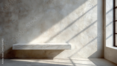 Minimalist interior with marble shelf and dramatic light shadows concrete floor textured wall