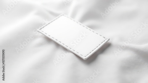Minimalist label woven onto textured light fabric, showcasing stitching in soft lighting.