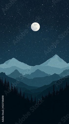 Minimalist Layered Mountain Range Under Starry Sky with Full Moon, Deep Blues, Silhouetted Trees, Peaceful, Vector Style