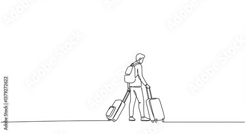 Minimalist line art portraying a traveler with luggage in stark black and white