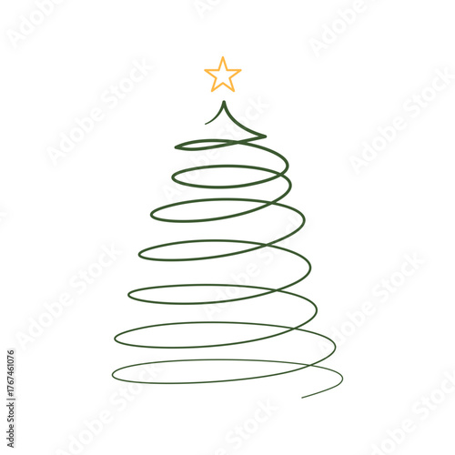 Minimalist line art vector illustration of a Christmas tree drawn in a single continuous dark green line, forming a spiral shape topped with a simple golden star outline.