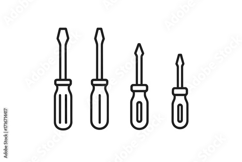 Minimalist linear screwdriver icons set. Flathead and Phillips head tools for mechanics. Vector cartoon illustration of hardware for repair, construction or craft work.