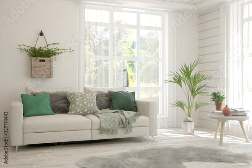 Minimalist living room in white color with sofa and summer landscape in window. Scandinavian interior design. 3D illustration