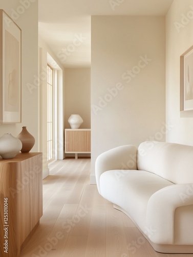 Minimalist living space featuring a modern white sofa and wooden side table in a neutral interior.