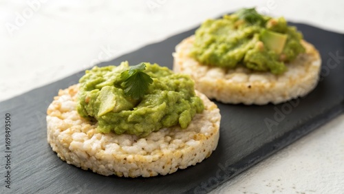 Minimalist Morning Meal Composition Concept. Rice cakes topped with avocado spread and herbs on a black slate plate.