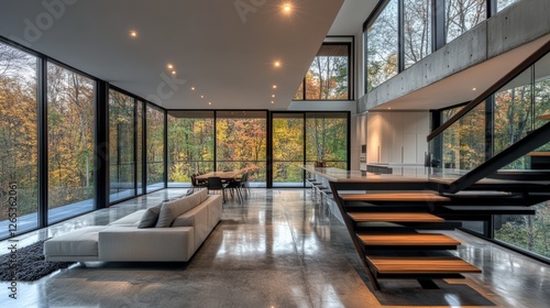 Minimalist open-concept loft with floor-to-ceiling windows, polished concrete flooring, and a floating staircase, pure architectural elegance.